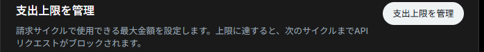 もしbotが暴走してAPIを投稿しまくっても、この金額に達したらそれ以上は動かないよ、というやつです。デフォルトでは「上限なし」(使い続けるよ)になっています。